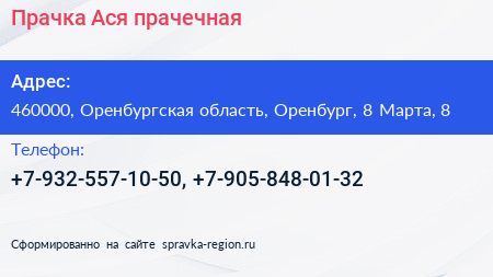 Прачка Ася, прачечная по адресу 460000, Оренбургская область, Оренбург, 8 Марта, 8 в дальнейшем Организация, размещена в следующих категориях: