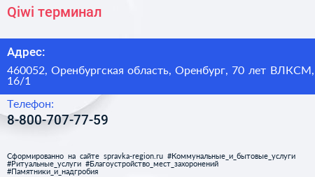 Qiwi, терминал по адресу 460052, Оренбургская область, Оренбург, 70 лет ВЛКСМ, 16/1 в дальнейшем Организация, размещена в следующих категориях: