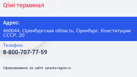 Qiwi, терминал по адресу 460044, Оренбургская область, Оренбург, Конституции СССР, 20 в дальнейшем Организация, размещена в следующих категориях: