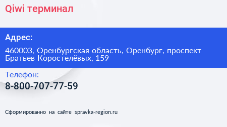 Qiwi, терминал по адресу 460003, Оренбургская область, Оренбург, проспект Братьев Коростелёвых, 159 в дальнейшем Организация, размещена в следующих категориях: