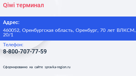 Qiwi, терминал по адресу 460052, Оренбургская область, Оренбург, 70 лет ВЛКСМ, 20/1 в дальнейшем Организация, размещена в следующих категориях: