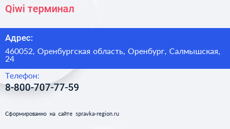 Qiwi, терминал по адресу 460052, Оренбургская область, Оренбург, Салмышская, 24 в дальнейшем Организация, размещена в следующих категориях: