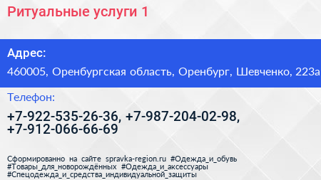 Ритуальные услуги №1 по адресу 460005, Оренбургская область, Оренбург, Шевченко, 223а в дальнейшем Организация, размещена в следующих категориях: