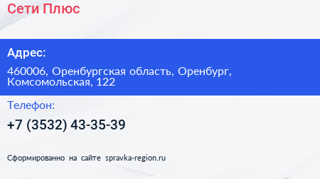 Сети Плюс по адресу 460006, Оренбургская область, Оренбург, Комсомольская, 122 в дальнейшем Организация, размещена в следующих категориях: