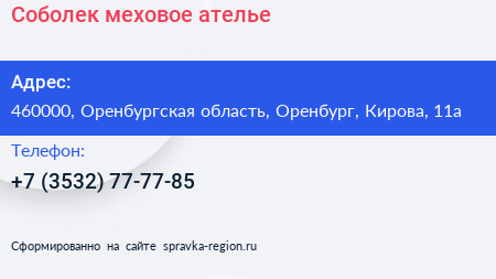 Соболек, меховое ателье по адресу 460000, Оренбургская область, Оренбург, Кирова, 11а в дальнейшем Организация, размещена в следующих категориях: