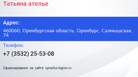 Татьяна, ателье по адресу 460060, Оренбургская область, Оренбург, Салмышская, 74 в дальнейшем Организация, размещена в следующих категориях: