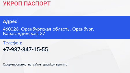 УКРОП ПАСПОРТ по адресу 460026, Оренбургская область, Оренбург, Карагандинская, 27 в дальнейшем Организация, размещена в следующих категориях:
