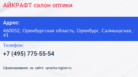 АЙКРАФТ, салон оптики по адресу 460052, Оренбургская область, Оренбург, Салмышская, 41 в дальнейшем Организация, размещена в следующих категориях: