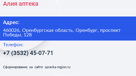 Алия, аптека по адресу 460026, Оренбургская область, Оренбург, проспект Победы, 128 в дальнейшем Организация, размещена в следующих категориях: