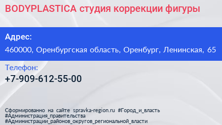 BODYPLASTICA, студия коррекции фигуры по адресу 460000, Оренбургская область, Оренбург, Ленинская, 65 в дальнейшем Организация, размещена в следующих категориях: