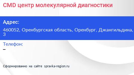 CMD, центр молекулярной диагностики по адресу 460052, Оренбургская область, Оренбург, Джангильдина, 3 в дальнейшем Организация, размещена в следующих категориях:
