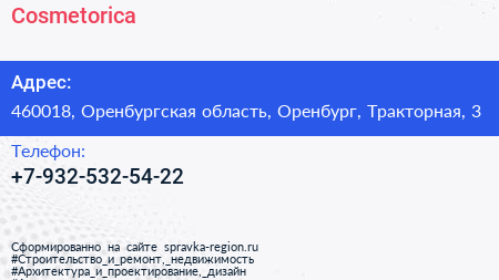 Cosmetorica по адресу 460018, Оренбургская область, Оренбург, Тракторная, 3 в дальнейшем Организация, размещена в следующих категориях:
