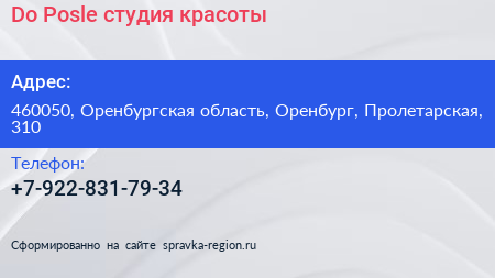 Do & Posle, студия красоты по адресу 460050, Оренбургская область, Оренбург, Пролетарская, 310 в дальнейшем Организация, размещена в следующих категориях:
