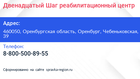 Двенадцатый Шаг, реабилитационный центр по адресу 460050, Оренбургская область, Оренбург, Чебеньковская, 39 в дальнейшем Организация, размещена в следующих категориях: