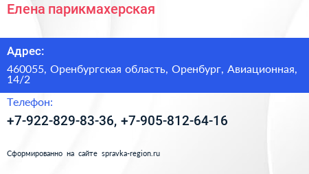 Елена, парикмахерская по адресу 460055, Оренбургская область, Оренбург, Авиационная, 14/2 в дальнейшем Организация, размещена в следующих категориях: