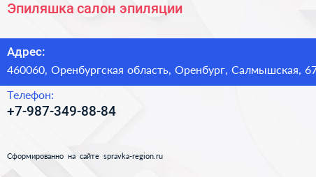 Эпиляшка, салон эпиляции по адресу 460060, Оренбургская область, Оренбург, Салмышская, 67 в дальнейшем Организация, размещена в следующих категориях: