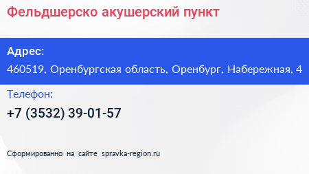 Фельдшерско-акушерский пункт по адресу 460519, Оренбургская область, Оренбург, Набережная, 4 в дальнейшем Организация, размещена в следующих категориях: