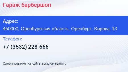 Гараж, барбершоп по адресу 460000, Оренбургская область, Оренбург, Кирова, 13 в дальнейшем Организация, размещена в следующих категориях: