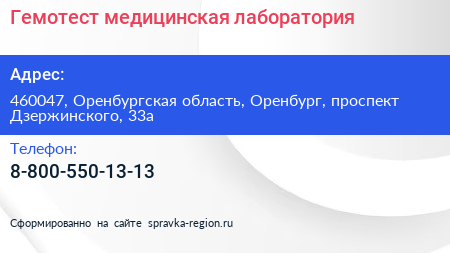 Гемотест, медицинская лаборатория по адресу 460047, Оренбургская область, Оренбург, проспект Дзержинского, 33а в дальнейшем Организация, размещена в следующих категориях: