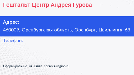 Гештальт-Центр Андрея Гурова по адресу 460009, Оренбургская область, Оренбург, Цвиллинга, 68 в дальнейшем Организация, размещена в следующих категориях:
