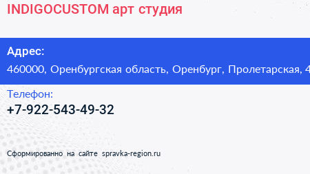 INDIGOCUSTOM, арт-студия по адресу 460000, Оренбургская область, Оренбург, Пролетарская, 4 в дальнейшем Организация, размещена в следующих категориях: