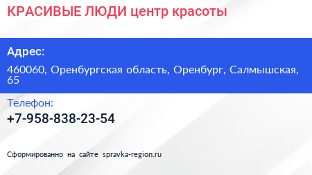 КРАСИВЫЕ ЛЮДИ, центр красоты по адресу 460060, Оренбургская область, Оренбург, Салмышская, 65 в дальнейшем Организация, размещена в следующих категориях: