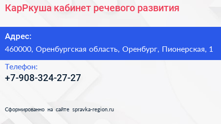 КарРкуша, кабинет речевого развития по адресу 460000, Оренбургская область, Оренбург, Пионерская, 1 в дальнейшем Организация, размещена в следующих категориях:
