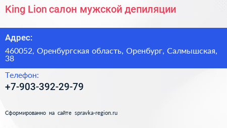 King Lion, салон мужской депиляции по адресу 460052, Оренбургская область, Оренбург, Салмышская, 38 в дальнейшем Организация, размещена в следующих категориях: