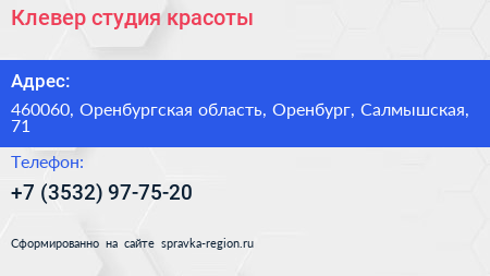 Клевер, студия красоты по адресу 460060, Оренбургская область, Оренбург, Салмышская, 71 в дальнейшем Организация, размещена в следующих категориях: