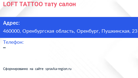 LOFT TATTOO, тату-салон по адресу 460000, Оренбургская область, Оренбург, Пушкинская, 23 в дальнейшем Организация, размещена в следующих категориях: