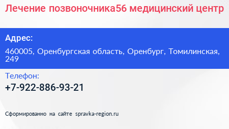 Лечение позвоночника56, медицинский центр по адресу 460005, Оренбургская область, Оренбург, Томилинская, 249 в дальнейшем Организация, размещена в следующих категориях: