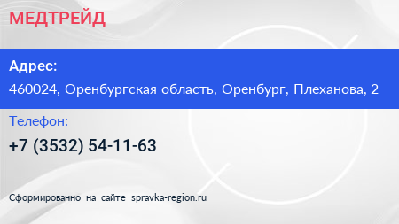 МЕДТРЕЙД по адресу 460024, Оренбургская область, Оренбург, Плеханова, 2 в дальнейшем Организация, размещена в следующих категориях: