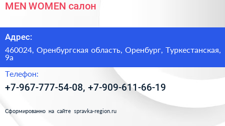 MEN & WOMEN, салон по адресу 460024, Оренбургская область, Оренбург, Туркестанская, 9а в дальнейшем Организация, размещена в следующих категориях: