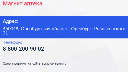 Магнит, аптека по адресу 460048, Оренбургская область, Оренбург, Рокоссовского, 31 в дальнейшем Организация, размещена в следующих категориях: