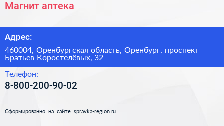 Магнит, аптека по адресу 460004, Оренбургская область, Оренбург, проспект Братьев Коростелёвых, 32 в дальнейшем Организация, размещена в следующих категориях: