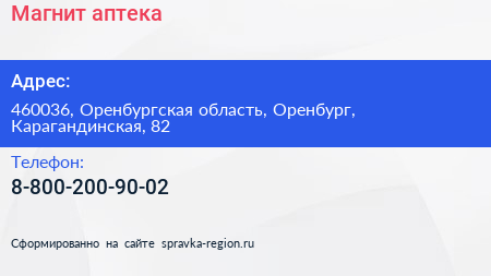 Магнит, аптека по адресу 460036, Оренбургская область, Оренбург, Карагандинская, 82 в дальнейшем Организация, размещена в следующих категориях:
