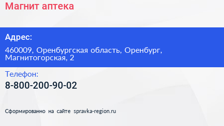 Магнит, аптека по адресу 460009, Оренбургская область, Оренбург, Магнитогорская, 2 в дальнейшем Организация, размещена в следующих категориях: