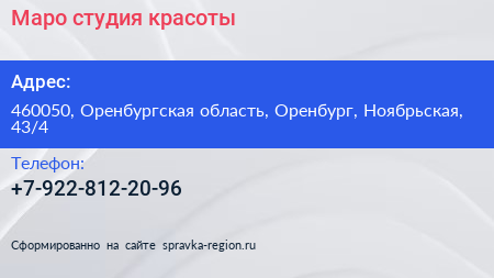 Маро, студия красоты по адресу 460050, Оренбургская область, Оренбург, Ноябрьская, 43/4 в дальнейшем Организация, размещена в следующих категориях:
