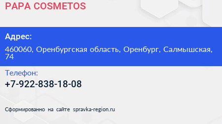 PAPA COSMETOS по адресу 460060, Оренбургская область, Оренбург, Салмышская, 74 в дальнейшем Организация, размещена в следующих категориях:
