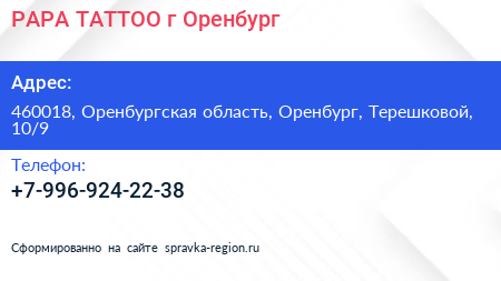 PAPA TATTOO, г. Оренбург по адресу 460018, Оренбургская область, Оренбург, Терешковой, 10/9 в дальнейшем Организация, размещена в следующих категориях: