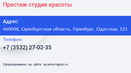 Престиж, студия красоты по адресу 460048, Оренбургская область, Оренбург, Одесская, 121 в дальнейшем Организация, размещена в следующих категориях: