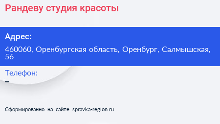 Рандеву, студия красоты по адресу 460060, Оренбургская область, Оренбург, Салмышская, 56 в дальнейшем Организация, размещена в следующих категориях:
