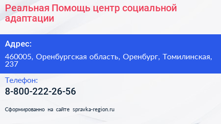 Реальная Помощь, центр социальной адаптации по адресу 460005, Оренбургская область, Оренбург, Томилинская, 237 в дальнейшем Организация, размещена в следующих категориях: