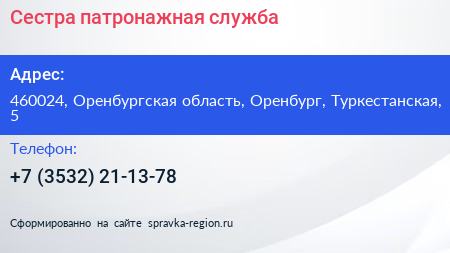 Сестра, патронажная служба по адресу 460024, Оренбургская область, Оренбург, Туркестанская, 5 в дальнейшем Организация, размещена в следующих категориях: