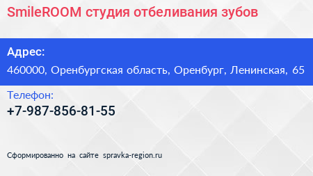 SmileROOM, студия отбеливания зубов по адресу 460000, Оренбургская область, Оренбург, Ленинская, 65 в дальнейшем Организация, размещена в следующих категориях: