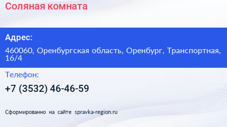 Соляная комната по адресу 460060, Оренбургская область, Оренбург, Транспортная, 16/4 в дальнейшем Организация, размещена в следующих категориях: