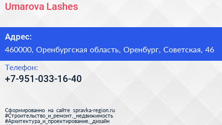 Umarova Lashes по адресу 460000, Оренбургская область, Оренбург, Советская, 46 в дальнейшем Организация, размещена в следующих категориях: