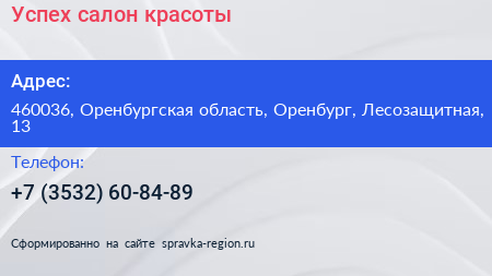 Успех, салон красоты по адресу 460036, Оренбургская область, Оренбург, Лесозащитная, 13 в дальнейшем Организация, размещена в следующих категориях: