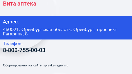 Вита, аптека по адресу 460021, Оренбургская область, Оренбург, проспект Гагарина, 8 в дальнейшем Организация, размещена в следующих категориях: