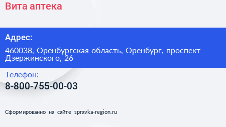 Вита, аптека по адресу 460038, Оренбургская область, Оренбург, проспект Дзержинского, 26 в дальнейшем Организация, размещена в следующих категориях: